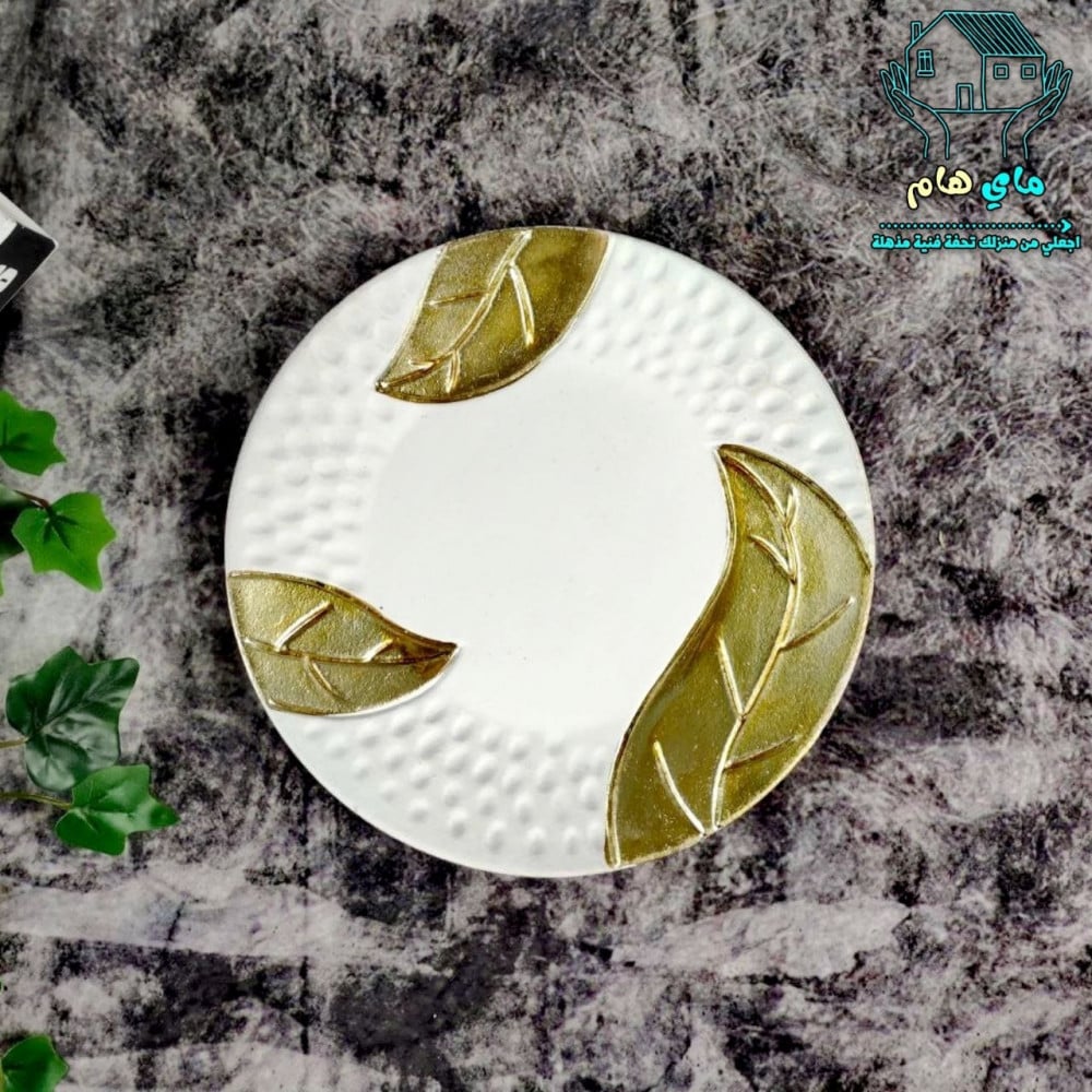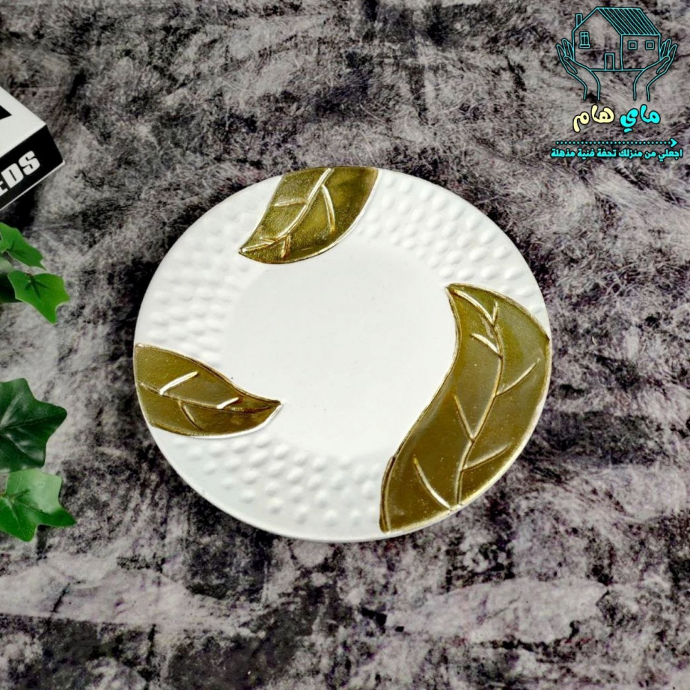 صحن تقديم خشبي صغير دائري ابيض مع نقشة ورق الشجر الذهبية 22 سم